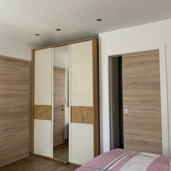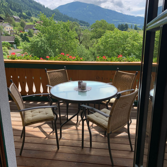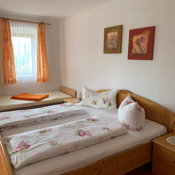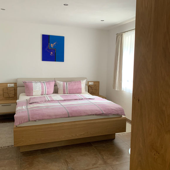 Die beiden Doppelzimmer mit Balkon befinden sich im Bauernhaus im ersten oder zweiten Stockwerk. Sie sind mit viel Holz liebevoll eingerichtet und verfügen über Dusche mit WC, einen Kühlschrank und natürlich einem Balkon zum Sonne tanken.